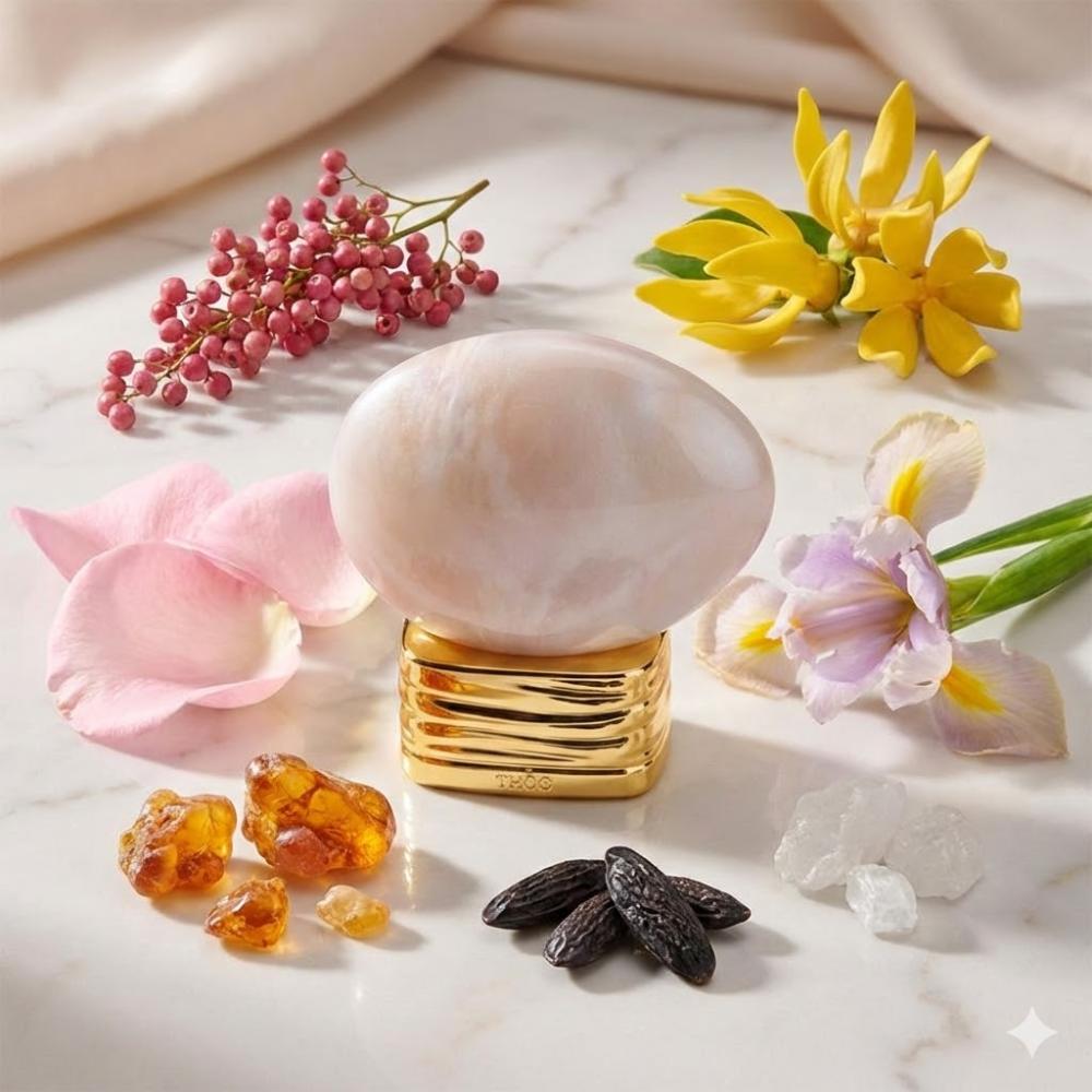 - القلب: باقة زهرية رقيقة من الورد والسوسن (Iris) تمنح العطر طابعاً بودرياً ناعماً.